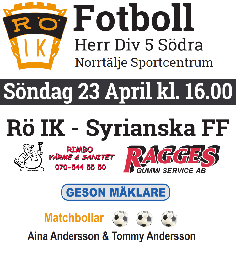 Nu på söndag 23/4 fortsätter omgång 2 i div 5 södra. Rö IK tar emot Syrianska FF på konstgräset vid Sportcentrum i Norrtälje. Matchen startar 16:00. Väl mött! /Rö IK Herrar 18 apr 2023 0kommentarer
