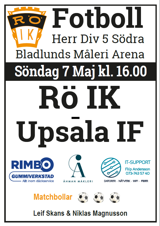 Då är det dags för hemmapremiär i både div 5 och div 7 för Rö IK. Matcherna spelas på Blandlunds Måleri Arena på Ekevallen i Rö. Först värmer vi upp med div 7 där Rö IK 2 tar emot IF Ferro på lördagen 6 maj. Matchen startar 11.00. Därefter div 5 där Rö IK tar emot Uppsala IF på söndagen 7 maj. Matchen startar 16:00. Välkomna! /Rö IK Herrar 30 apr 2023 0kommentarer