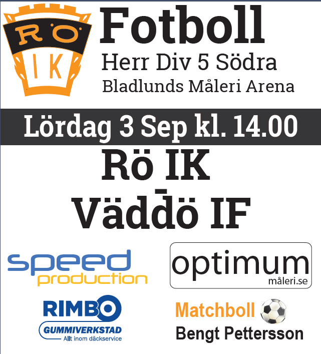 Nu är det dags för ett riktigt roslagsderby. Nu på lördag 3/9 gästas vi av Väddö IF som kommer till Bladlunds Måleri Arena på Ekevallen i Rö. Matchen startar 14:00. Väddö ligger på 6:e plats i tabellen och Rö IK på 7:e. Det skiljer bara 2 poäng mellan lagen. Detta garanterar en fartfylld och actionladdad tillställning. Missa det inte! Kom och heja på ditt lag. Väl mött! /Rö IK Herrar 31 aug 2022 0kommentarer