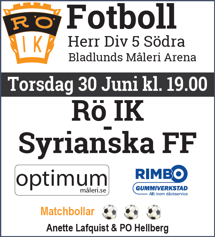 Välkomna till Ekevallen och Rö IK på torsdag för sista hemmamatchen innan sommaruppehållet. Vi tar emot Syrianska FF på Bladlunds Måleri Arena i Rö. Serie: Divison 5 södra Dag: Torsdag 30/6 Matchstart: 19:00 Båda lagen ligger på 15 poäng efter 12 spelade matcher. Även division 7-laget spelar match i veckan och åker till Lummevi IP i morgon tisdag och möter Edsbro IF 19:00. Träningen är på onsdag istället kl.19:00 med efterföljande spelarmöte 20:30. Varmt välkomna! /Rö IK Herrar 27 jun 2022 0kommentarer