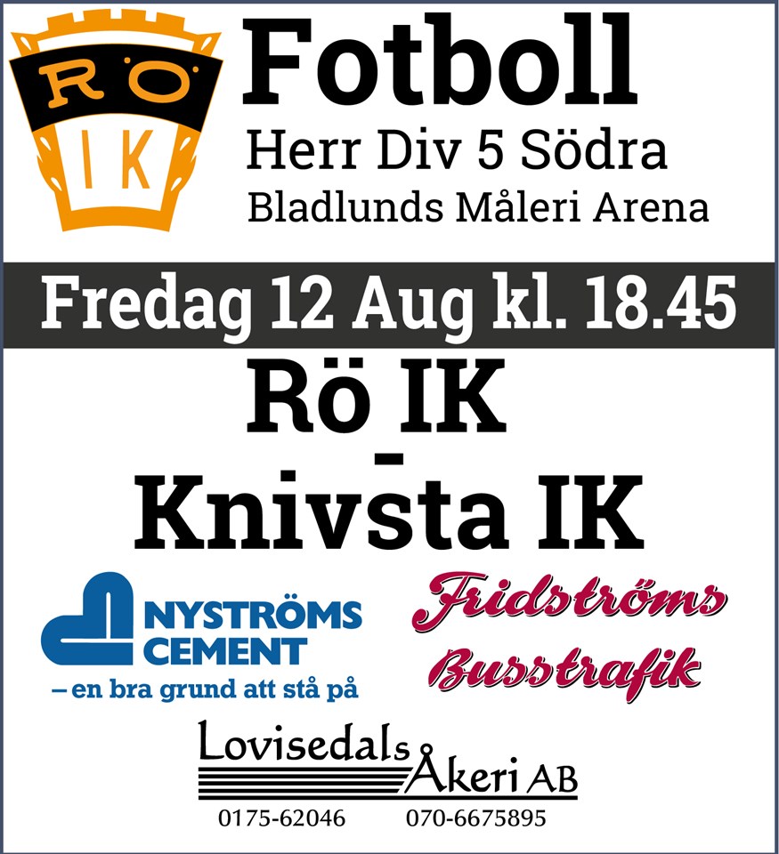 Vi tar emot Knivsta IK hemma på Bladlunds Måleri Arena - Ekevallen Rö nu på fredag 12/8. Matchen startar 18:45. Väl mött! /Rö IK Herrar 8 aug 2022 0kommentarer