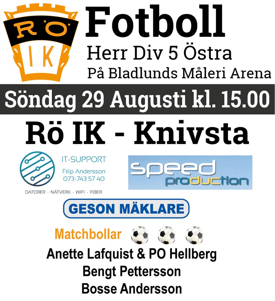 Nästa match för Rö IK är hemma mot Knivsta IK på söndag 29/8 kl.15:00. Nästa match för Rö IK 2 är borta mot Olands FF 2 på lördag 28/8 kl:14:00. Träning på tosdag 26/8 kl.19:00 som vanligt. Herrar 24 aug 2021 0kommentarer