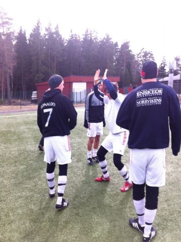 15 (?) man på bygget igår.Tempot såg inte alls bra ut, sämsta på länge, så det måste vi jobba med. Vet vi om! Klart det blir jobbigt att hänga med i serien annars. Några schyssta kombinationslir mellan Matte Liss och Nicke var roliga att se. Hillström kämpar och sliter men var är siktet? Hemma? På Läktarn? Även om karln inte är tilltänkt som striker i år så kommer han komma i lägen på matcherna, det är han bra på att göra, men det måste bli mål. B a l j a. Fredde, Moberg och Khalid gör alla förtjänstfulla insatser i sina backlinjer, klart det är bra och viktigt, för med tanke på att vi har svårt med målskyttet måste det stämma bakåt från omgång 1, så är det bara! Hemläxa på offsideregeln också. Det är inget fel med det, även om vi borde kunna den...Sen måste vi ha bra bollar framgent! Kåre borta måndag. 1400. Guld! Viktigt att vinna den för en bra känsla inför Funbo. Kallade, som en annan han oppfatta på träningen igår: Liss Junior Liss Senior Marcus Khalid Seppberg Lyder Mange Wisell Happy Easter, blokes! Vi kommer att höras!