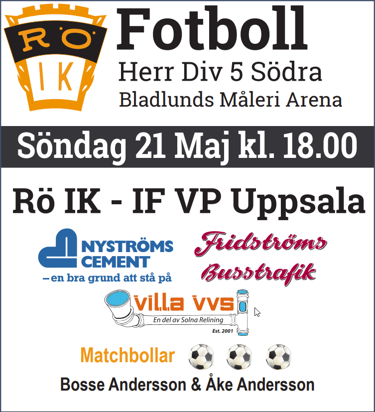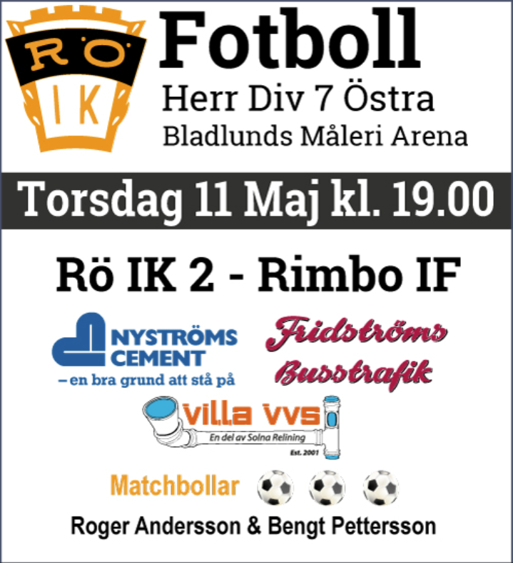 Efter oavgjort mot Ferro hemma ligger Rö IK 2 på en andraplats i tabellen. Nu fortsätter vi med ett riktigt Roslagsderby. Rö IK 2 tar emot Rimbo IF i morgon torsdag kväll på Bladlunds Måleri Arena på Ekevallen i Rö. Matchen startar 19:00. Väl mött! /Rö IK Herrar 10 maj 2023 0kommentarer