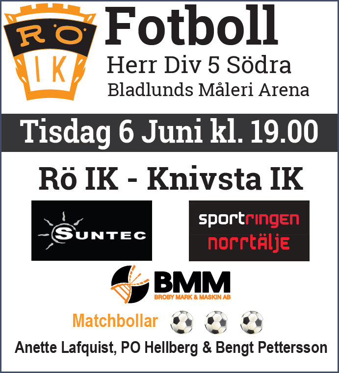 Då är det dags igen för match på Bladlunds Måleri Arena på Ekevallen i Rö. Rö IK tar emot Knivsta IK i division 5 södra. Matchen är nu på tisdag 6 juni med start kl. 19.00. Väl mött! Rö IK Herrar 3 jun 2023 0kommentarer