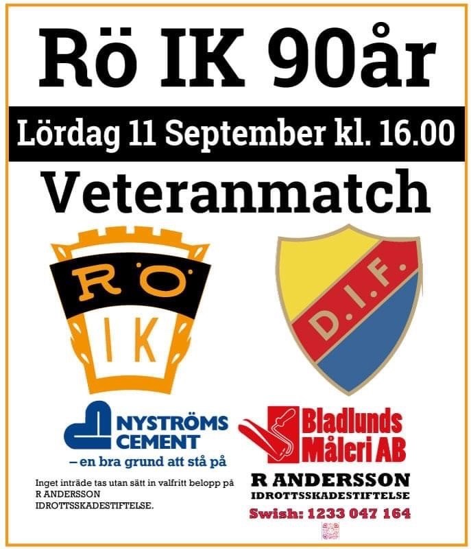 Rö IK fyller 90 år!! För att uppmärksamma det kommer vi ha en jubileumsmatch mot Djurgårdens veteraner. Bosse Andersson kommer coacha DIF och spelare som bl a Steve Galloway och Markus "Mackan" Karlsson kommer vara med. Rö IK ställer upp med en hel del gamla rävar. Kom och se vilka som spelar... Matchen spelas nu på lördag 11/9 kl. 16:00 vid Bladlunds Måleri Arena på Ekevallen i Rö. Inget inträde kommer tas men valfri summa kan swishas till R Andersson Idrottskadestiftelse på nr 123 30 47 164. Varmt välkomna! Rö IK Rö Idrottklubb 7 sep 2021 0kommentarer