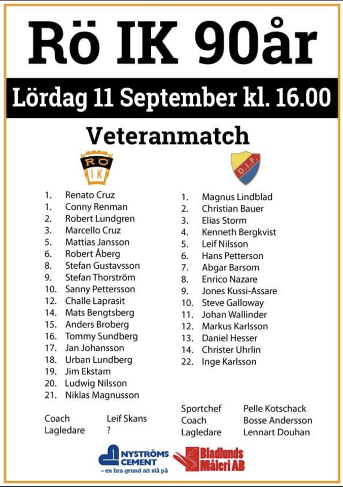 Här kommer laguppställningen inför lördagens jubileumsmatch mot DIF veteraner. Klicka på bilden. Sponsorer är: Nyströms cement och Bladlunds Måleri Rö Idrottklubb 9 sep 2021 0kommentarer