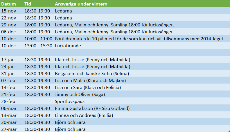 Här kommer lite information från föräldramötet igår. Ingen påminnelse skickades ut så förståeligt att alla inte kunde (smile). 1. Vi kom överens att fortsätta med tjejskoj under vintern och att vi någon gång under april kan börja spela fotboll tillsammans. Roma IF anmäler till seriespel även i år (bara för tjejer). 2. Tjejerna fick frågan förra veckan om luciauppträdande vid Kungsgården 10 dec. Se separat information via mail där Malin (Majken) och Jenny (Molly) har tagit taktpinnen. 3. Ledarna tar ansvar för att hitta på aktiviteter dessa träffar innan jul. Sen är det, likt förra föräldramötet, att alla föräldrar tar en vecka var och hittar på aktivitet för våra gemensamma barn. En av ledarna kommer finnas med då vi i Roma IF följer Riksidrottsförbundets riktlinjer att ha lämnat in utdrag från belastningsregistret. Vill man ställa upp och lämna in sådant så vi ledare inte behöver vara med varje vecka så se denna länk hur du gör: Registerutdrag Roma IF 4. Skriv därmed i kommentarsfältet vilken vecka du/ni tar ansvar för att hitta på valfri aktivitet. Då och då uppdaterar Björn bilden så det är enkelt och tydligt vem som ansvarar vilken vecka. Aktiviteten kan vara precis vad som helst (typ).