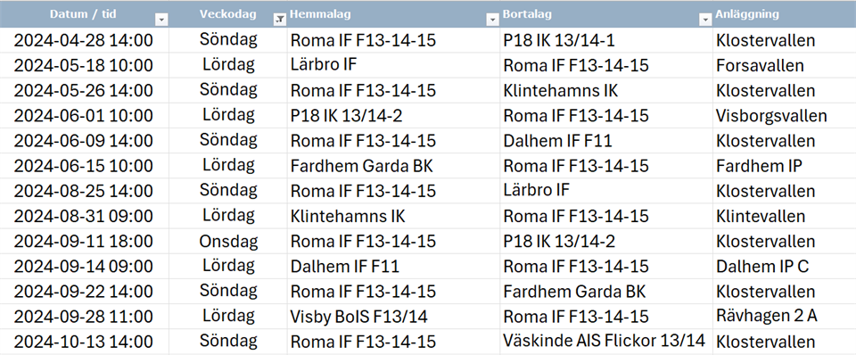 Hej, Nu har vi precis haft möte, Emma, Conny, Björn och Jimmy. Vi pratade då om följande: 1. Vi fyra är fotbollsledare så länge, Emma är huvudledare vår-höst. Vi tar tacksamt emot fler kvinliga ledare som förebilder till våra tjejer. Prata gärna med oss om intresse finns. 2. Vi tränar nästa gång måndag 8 april 18:30-19:30 på konstgräsplanen och tränar måndagar på konstgräset under april eller tills vi om några veckor får gå ut på gräsplanen. Då tränar vi onsdagar 18:30-19:30. 3. Vi har föräldramöte nästa onsdag 10 april kl 18:30 i pokalrummet. Då pratar vi bland annat om lagets serie 2024, ledare, lagföräldrar, samsyn/förhållningssätt för barnens sociala medier inom laget och närmast att det är vårt lag som ansvarar för årets kiosk vid valborg. 4. Matcherna för årets serie är inte publicerade men ser ut enligt bilden som finns till denna nyhet. Ses nästa måndag (avlämning/hämtning vid träning) men främst på föräldramötet 10 april. Ledarna