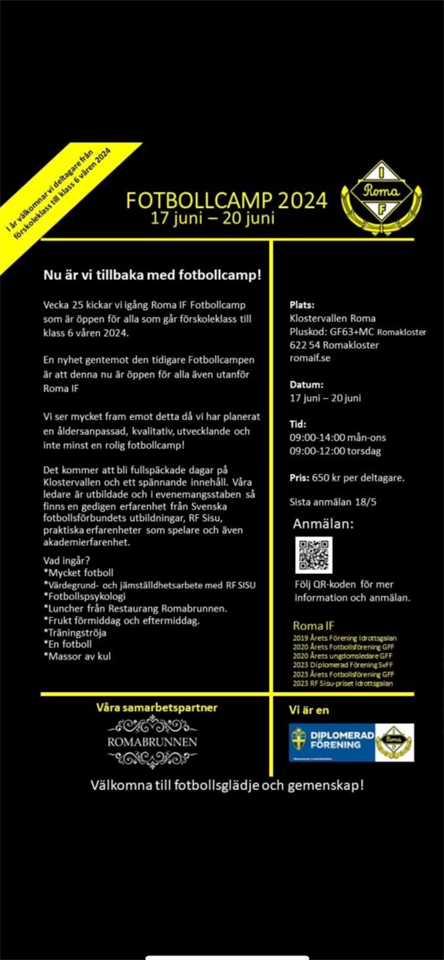 Flera anmälan har kommit in (bland annat från vårat tjejlag) till årets Fotbollcamp. I sommar, närmare bestämt 17-20 juni så startar Roma IF upp fotbollsskola igen som vi har valt att kalla Fotbollcamp. En skillnad från tidigare år är att vi har öppnat upp för spelare utanför Roma IF (inom åldern). Läs all information och anmälan via länken nedan eller QR-koden i bilden. Varmt välkomna till en fotbollcamp i Roma IFs regi. Länk till Roma IF Fotbollcamp