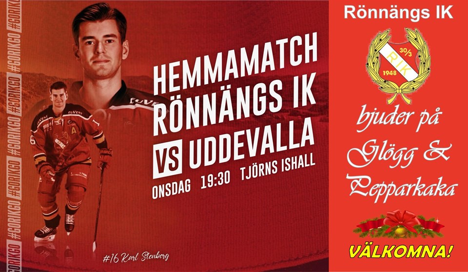 Onsdag 29 november spelar Rönnängs A-lag hemmamatch mot Uddevalla HC. Klubbens styrelse kommer i samband med evenemanget att servera Glögg, Saft och Pepparkaka i ishallen till alla besökare.