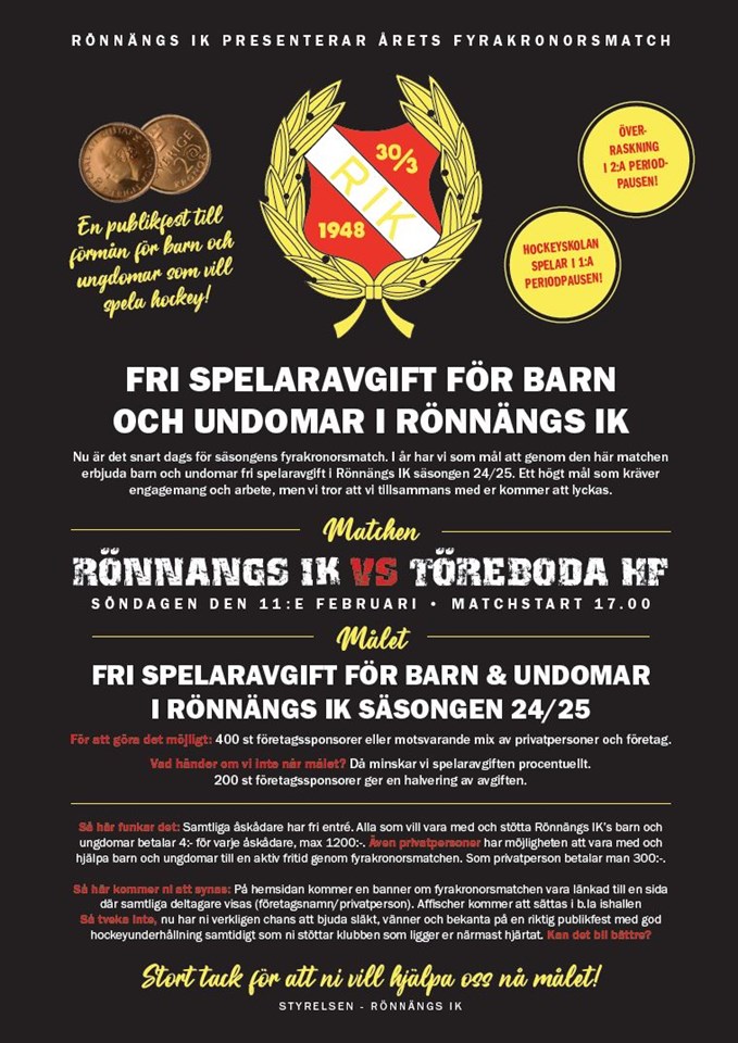 Årets fyrakronorsmatch är Rönnängs IK mot Töreboda IF den 11:e februari i Tjörns ishall.