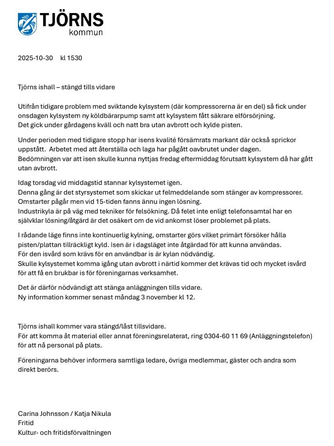 Vi har redan informerat genom ledare och andra aktiva inom klubben, men vi vill även nå ut till samtliga som kan tänkas vara berörda av att ishallen sedan igår eftermiddag tillfälligt är stängd.
