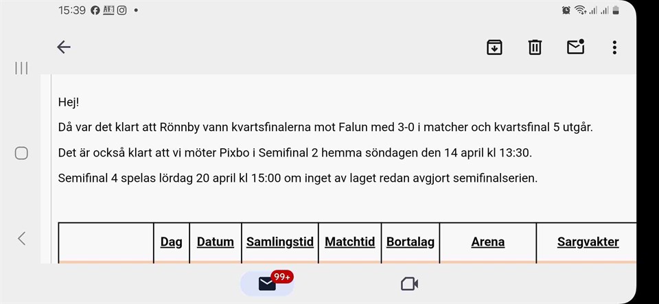 Hej på er! Så var det april och slutspurtsmånad… Ledarna arbetar på att få till ett föreningsbrett framtidsmöte, men det verkar gå lite trögt. Vi tänkte uppdatera lite kring närmaste tiden. På fredag 5/4 är det träning ”som vanligt”. Sargvaktandet på söndag 7/4 utgick, kanske ni såg. På måndag 8/4 är det träningsmatch mot P10/11 INFÖR Mälarenergi – ska du delta på cup, delta gärna på match. SVART träningströja som matchställ! Samling kl. 18.15, bygge av sarg, match och rivande av sarg. På tisdag 9/4 är det träningsmatch mot P10/11 INFÖR Mälarenergi – ska du delta på cup, delta gärna på match. ORANGE 30 årströja som matchställ! Samling kl. 17.45, bygge av sarg, match och rivande av sarg. På onsdag 10/4 lättare träning med stort fokus på Mälarenergi – Bra om ni är på plats. Fredag 12/4: Se till att de fått i sig något att äta efter skolan. Samling kl. 16.45 inne vid kiosken ABB Arena SYD. Ombytta till ordinarie matchställ, men med overall på för utomhuspromenad. Kom ihåg skor, glasögon, klubba, vattenflaska. Efter match samlas grabbarna en stund för återkoppling, sedan hem och ladda! Match1 spelas på ABB arena syd Plan 3 kl. 17.45 På lördag 13/4: Samling kl. 09.00 på ORIENTALEN för gemensam frukost som Maria och Anna-Karin fixar. Grabbarna kommer gemensamt promenera till match2 som är kl. 12.30 på Västerås Arena C. Se till att de har handduk och en tröja att byta med. Gärna duschgrejer. Efter match2 tar de sig med buss eller skjuts till Rudbeck för lunch som laget förbetalt. Match3 spelas kl. 16.15 på Råbyhallen, grabbarna hänger ihop hela dagen och kommer dit i samlad trupp. (Skjutshjälp kan behövas.) Om någon behöver samlas upp så är det 15.15 som gäller vid hallen. Mellis finns. Återsamling och reflektion efter match. Eventuellt skjuts till nästa hall. Beroende på placering så spelas match4 kl. 19.25 på lördagen 13/4 på Mälarenergi, K-borg, ABB Arena, Västerås Arena eller Petterberg. Detta KAN BLI cupens sista match (men det tror vi såklart inte). Söndag 14/4: Om annan placering i gruppen så spelas match4 kl. 08.55 på någon av hallarna, Mälarenergi, ABB arena syd eller K-Borg, Pettersberg. Bra frukost ätes hemma! Tröja tas med för ombyte, likaså handduk. Samling vid hall som anges på lördag kl. 7.45 med kläder för utomhuspromenad. Kom ihåg all utrustning. Om grabbarna går vidare från denna match så spelas nästa match5- Semifinal i A-slutspel kl. 12.35 i Västerås Arena eller ABB arena, Maria och Anna-Karin kommer som det ser ut nu se till att grabbarna får lunch. Mellis finns. Om de går vidare till final så spelas denna match6 kl. 17.25 söndagen den 14/4 på ABB arena Syd. Vi ber om ursäkt om någon av ovanstående uppgifter är felaktiga. Spelschemat har förändrats i sitt utförande sedan det lades in på laget.se och har nu nya ”namn” på matcherna, detta ska jag försöka uppdatera. Vid frågor kontakta någon av ledarna. Hejja Rönnby!!!