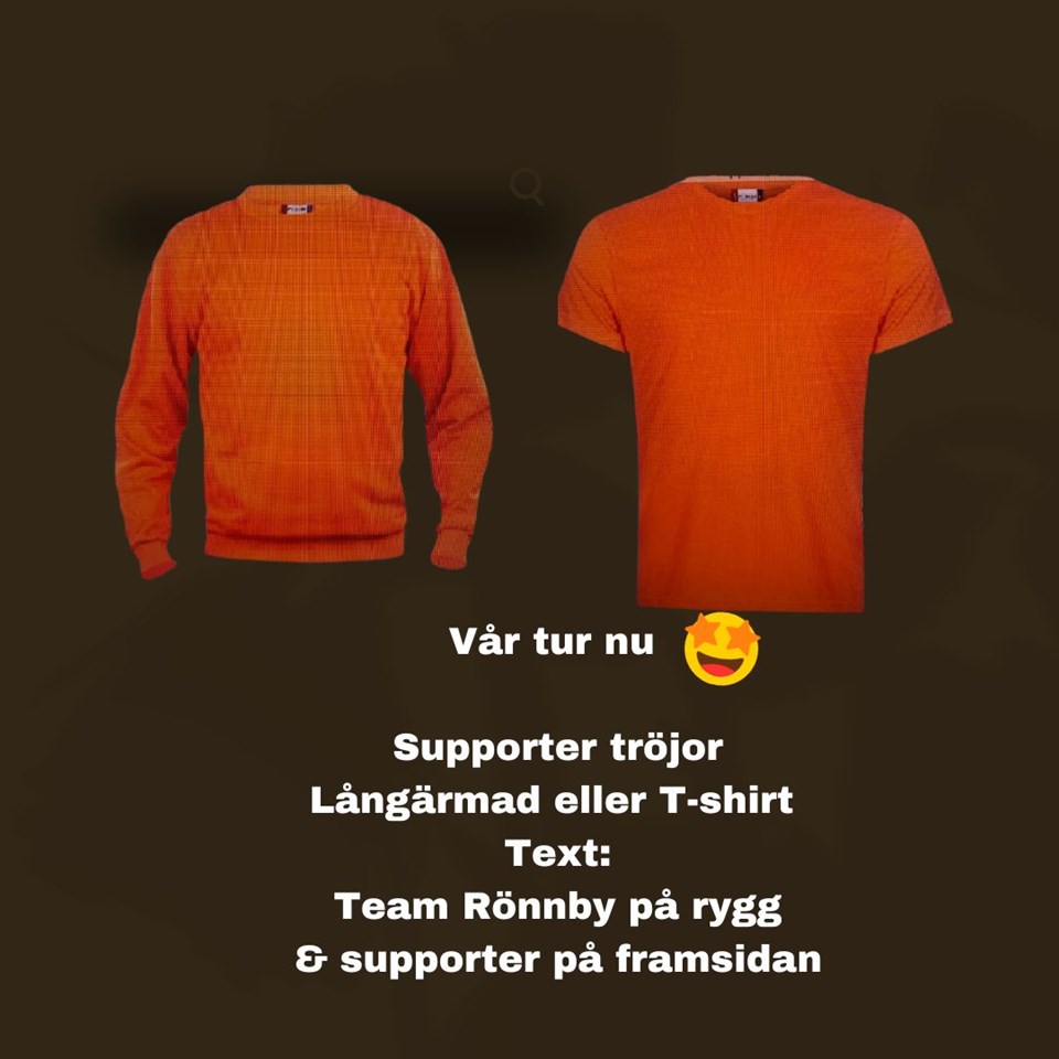Hej på er! Vi har nu kommit vidare i supportertröja- frågan och Caspers mamma Jenny kan fixa. T-shirt herr modell med Team Rönnby på rygg och supporter på framsidan. Långärmad Unisexmodell Team Rönnby på rygg och supporter på framsidan. Pris t-shirt Maxpris 110 kr beroende på hur många vi beställer. Pris Långärmad maxpris 200 kr beroende på hur många vi beställer. Skicka SMS så snabbt ni bara kan, men senast söndag 24/9 Långärm strl. antal T-shirt strl antal 070-646 45 10 Vi återkommer angående betalning. P.S Anna-Karin kommer dela ut kataloger för kryddförsäljning från klasspengar.se på träningen ikväll. Mer info om detta kommer senast fredag. D.S P.P.S Tränarna kommer under kvällen ut med mer info om Göranssons cup D.D.S Lagledningen gm