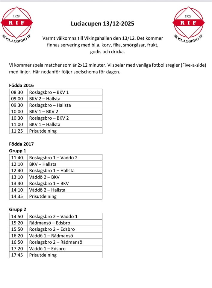 Hej! Här kommer lagindelningen för Luciacupen. Som tidigare har vi blandat åldrarna i några lag. 2016 Sixten Ludvig Ivar Bertil Milian Oliver Sam Jonas 2017 Roslagsbro 1 Henry Valter Dante Kevin Marvin Neo Meja Rosalgsbro 2 Vimar Eliot C Elliot H Lukas Jack Jakob Anton PF-16/17 30 nov 2025 6kommentarer