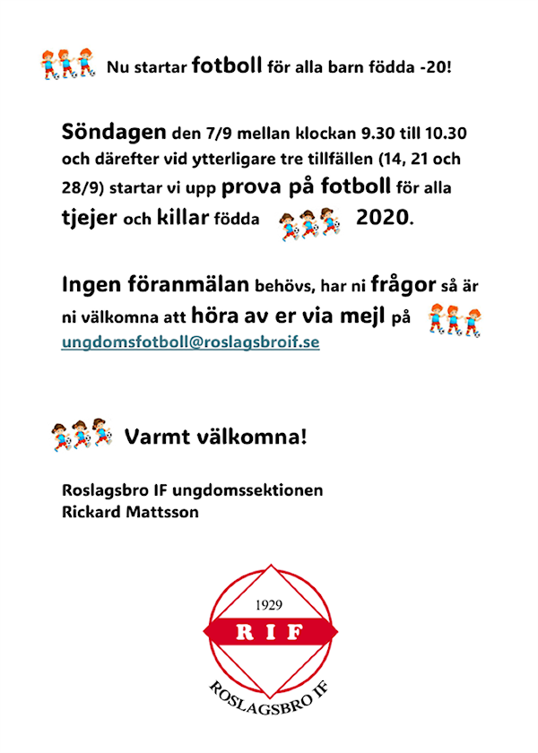 Ingen föranmälan behövs, har ni frågor så är ni välkomna att höra av er via mejl på ungdomsfotboll@roslagsbroif.se