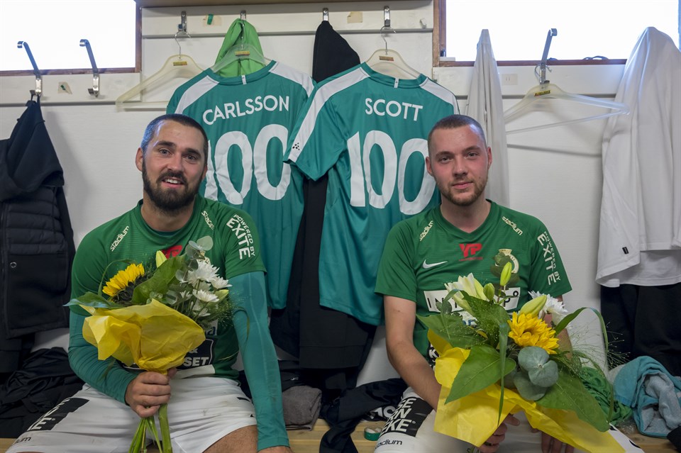 Rosseröds IK avslutade säsongen med att besegra Munkedals IF med 4-0 på vackra Hedevallen. Innan matchen startade uppvaktades Kevin Scott och Mathias Carlsson för 100 spelade matcher i den gröna tröjan. Båda spelarna har varit starkt bidragande till att Rosseröd idag spelar i division 4. Man har varit med på resan ifrån division 6 och igår spelade dom sin hundrade match var. Kevin har varit vår notoriske straffskytt genom åren och har på sina hundra matcher gjort 30 mål. Mathias Carlsson med förflutet ifrån allsvenskt spel med Ljungskile SK och spel i norska Levanger har gjort hela 100 mål. Det var även Mathias Carlsson som inledde målskyttet igår genom att göra dom två första målen i matchen. Sedan var det Jonathan Angmyr som fortsatte målskyttet i den andra halvleken och han ville inte vara sämre än Mathias och gjorde även han två mål. Kul för Jonathan att vara tillbaka igen efter sin hjärnskakning som gjort att han fått stå över träning och spel i nästan fyra veckor. Detta var säsongens sista match och vi slutar på en fin åttonde plats i tabellen och målsättningen inför i år har varit att hänga kvar. Att Karlsberg/Rosseröd hamnade i topp i division 6 Södra Bohuslän gör ju inte saken sämre. Nu tar vi lite välförtjänt ledighet innan vi sätter fokus på nästa säsong. Matchen finns att se i sin helhet på vår Facebooksida och där finns även Highlights ifrån matchen. Matchfakta: 1-0, 6 min Mathias Carlsson 2-0, 33 min Mathias Carlsson 3-0, 55 min Jonathan Angmyr 4-0, 67 min Jonathan Angmyr Domare: Kristopher Skoogh (Mycket duktig) Assisterande domare: Arben Demaj Kjell Johansson