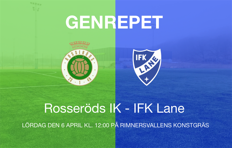 Det är dags för säsongens sista träningsmatch innan seriespelet äntligen drar igång. Vi genrepar mot våra seriekonkurrenter IFK Lane och det skall bli intressant att se vad dom båda lagen tänker bjuda på i dagens match, för vi möts ju igen om två veckor i seriespelet. Det kan ju tyckas lite konstigt att lägga ett genrep mot varandra när det är så kort tid emellan, men när träningsmatcherna bokades in så var serien ännu inte lottad. För att se vilket lag som har bäst "pokerface" så är du välkommen till dagens match. Rosseröds IK - IFK Lane Avspark idag lördag den 6 april kl. 12:00 på Rimnersvallens konstgräs Varmt välkommen!
