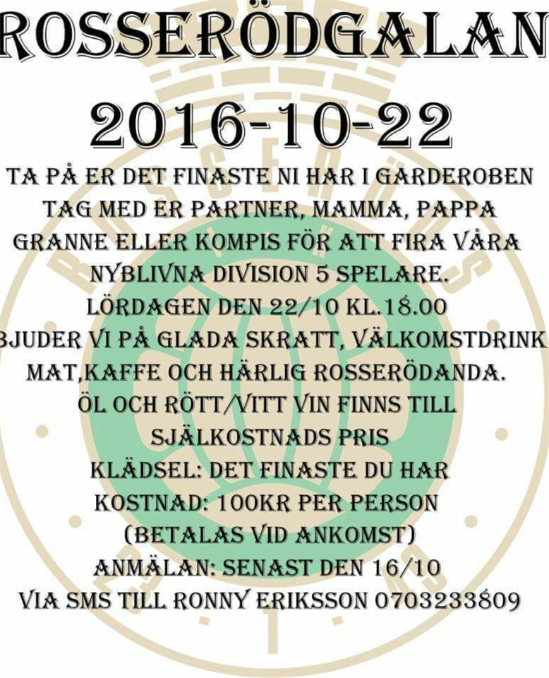 Nu var det dags för den årliga Rosserödgalan! Oscarsgalan i all ära men Rosserödgalan smäller högre. Många är nominerade i olika kategorier tex. Årets buse, Årets spelare, Årets mål. Och många fler kategorier. Info om när var hur kan ni läsa på bilden ovanför. Dela vidare detta så att alla har en chans att hinna anmäla sig. Det finns endast 100 platser så skynda er att anmäla er. Med vänlig hälsning. Rosserödgalans Kommittén