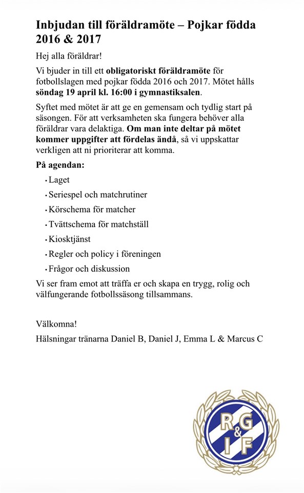 Klicka på bekräftelselänken i det mejl vi skickat dig för att börja ta emot uppdateringar från Rydaholms GoIF P-16-17.