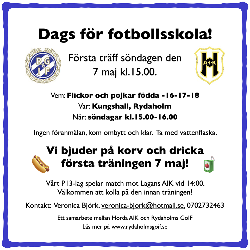 Nu börjar fotbollsskolan för tjejer och killar födda 2016, 2017 och 2018! Det är träning på söndagar klockan 15.00–16.00 med första träning nu på söndag 7 maj. Det är ingen föranmälan, bara kom dit ombytt och med vattenflaska. Vi bjuder på korv och dricka första träningen! Klockan 14:00 spelar vårt P13-lag mot Lagans AIK. Välkommen att kolla på den innan träningen om du vill! Kontakt: Veronica Björk, veronica-bjork@hotmail.se, 0702732463.