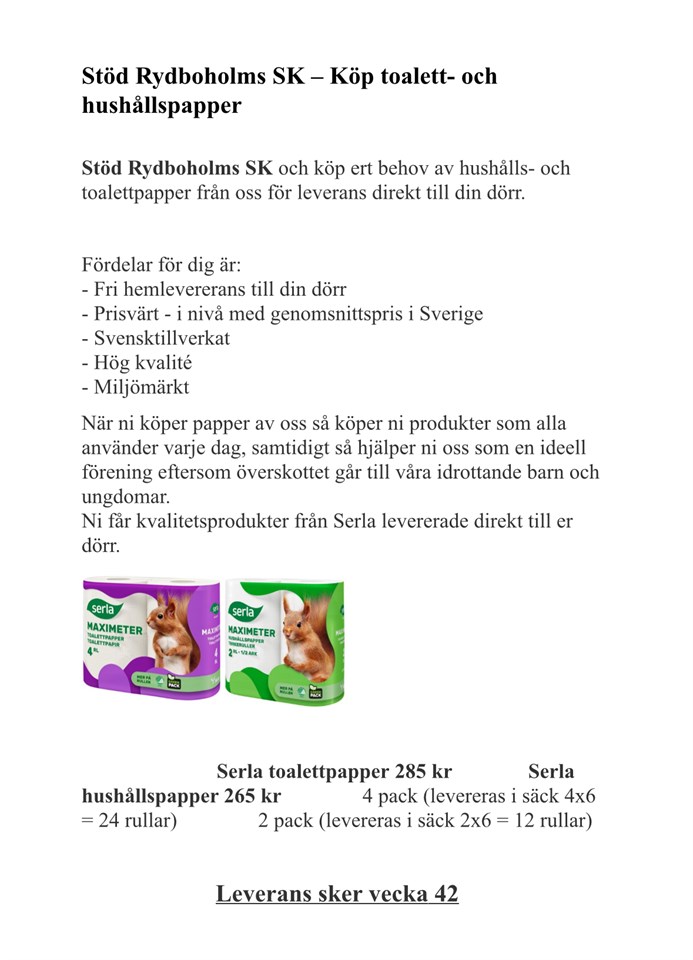 Hej, Nu drar vi i gång höstens försäljning av toa- och hushållspapper! Som vanligt är det bra om man säljer många balar då det är ett tillfälle att få in pengar till vår lagkassa så att vi kan åka på cuper och hitta på roliga aktiviteter. Målet är 30 balar per lag. Säljer vi över 30 balar så får laget 25 kr för varje bal vi säljer, utöver de 30 till vår egna lagkassa. 🕝 NÄR? Nu direkt! Deadline för inlämning av beställningslista är den 25/9. 💰HUR? Infogar bild med beskrivning om själva Serla-pappret. Finns även under Dokument här på Laget.se, där finner ni även en beställningslista. E-M kommer även att dela ut fysiska beställningslistor på kommande träning. TOA (6 förp/säck*4 rullar) 285 kr Hushåll (6 förp/säck*2 rullar) 265 kr Lämna in eller maila din beställningslista (fysiskt eller via mail): - Joanna (Loah R’s mamma) eller Eva-Marie (Lo W’s mamma) senast 25/9 - Joanna.olback@hotmail.se (Vi ska rapportera in dagen efter, så detta är en hård deadline.) LEVERANS: v.42 BETALNING: Kund betalar vid mottagandet av papper. Hör av er vid frågor! Mvh Joanna och E-M P-2017 (P8) 8 sep 2025 3kommentarer