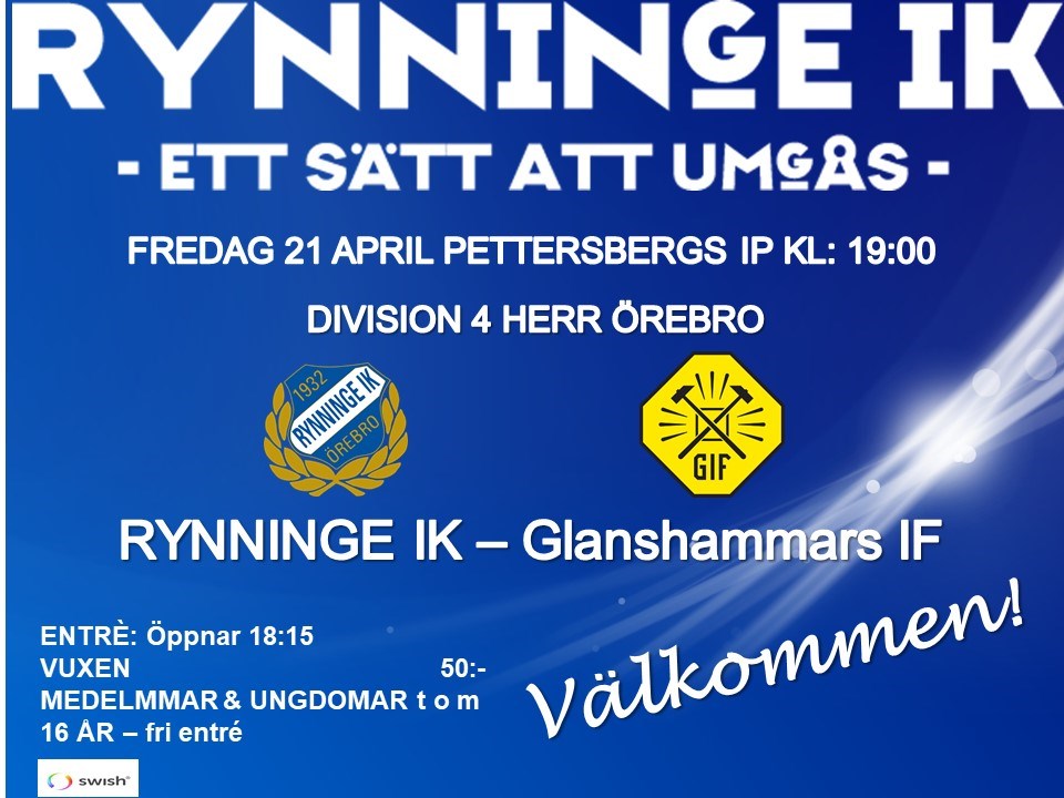 Herrlaget spelar match mot Glanshammars IF, nu på fredag 21 april klockan 19:00 Pettersbergs IP. Välkomna!