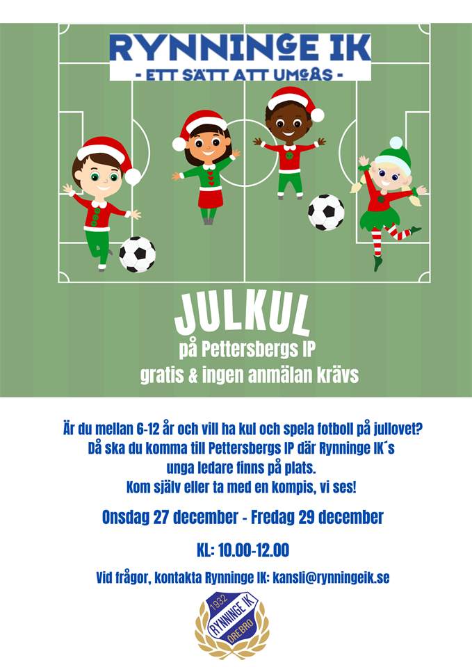 Snart är det Jullov! 🎄 Det betyder att alla barn i åldern 6-12 år är välkomna på Julkul på Pettersbergs IP. Onsdag 27- fredag 29 december kl.10.00-12.00 får du spela fotboll och ha kul tillsammans med Rynninge IK´s unga ledare. Det är gratis och vi bjuder på mellils. Hoppas vi ses! God jul till er alla Önskar Styrelsen P-12 20 dec 2023 0kommentarer