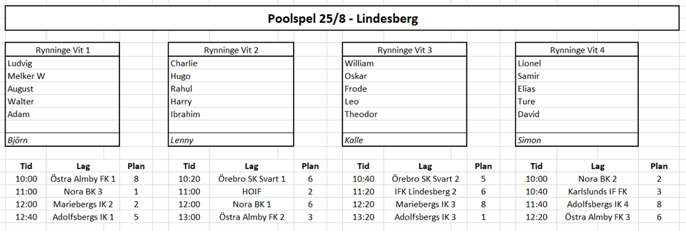 Hej! Här kommer lagindelning och spelschema inför poolspelet i Lindesberg nästa söndag. Lagindelning enligt följande: Lag 1: Adam, August, Ludvig, Melker W & Walter Lag 2: Charlie, Harry, Hugo, Ibrahim & Rahul Lag 3: Frode, Leo, Oskar, Theodor & William Lag 4: David, Elias, Lionel, Samir & Ture För er som vill åka gemensamt eller behöver skjuts till Lindesberg så träffas vi på Pettersberg, avfärd kl 8:45. För er som åker direkt vill vi att barnen är på plats senast 30 min innan första matchen börjar. Lag 1: 9:30, Plan 8 Lag 2: 9:50, Plan 6 Lag 3: 10:10, Plan 5 Lag 4: 9:30, Plan 2 Adressen är: Fritidsbyn (IFK Lindesberg), Fotbollsgatan 11, 711 34 Lindesberg Killarna får varsin matchtröja på plats. Vi vill att alla har med sig shorts, benskydd, fotbollsstrumpor, fotbollsskor och en vattenflaska. Tveka inte höra av er om ni har frågor. MVH Ledarna