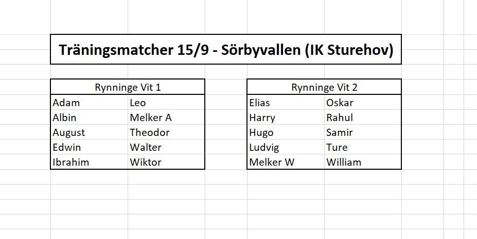 Hej! Det är totalt 20 anmälda barn till träningsmatcherna nästa söndag så vi har två fulla lag. Lag Blå kommer dessutom med ett lag, så vi är totalt tre Rynninge-lag som spelar mot tre Sturehov-lag. Plats: Sörbyvallen Tid: 10:00-12:00. OBS! Samling vid Sörbyvallen 09:30 Matcher: alla lag spelar tre matcher vardera, speltiden är 2*10 min (5 mot 5) Lag 1: Adam, Albin, August, Edwin, Ibrahim, Leo, Melker A, Theodor, Walter, Wiktor Lag 2: Elias, Harry, Hugo, Ludvig, Melker W, Oskar, Rahul, Samir, Ture, William Om någon har missat att anmäla sitt barn, hör av er till någon av oss tränare. Vi fyller på lagen så fort någon meddelar återbud. Alla får varsin matchtröja på plats. Vi vill att alla barn har på sig shorts, benskydd, fotbollsstrumpor, fotbollsskor samt en vattenflaska med sig. Vi förutsätter också att alla barn har minst en vårdnadshavare på plats under träningsmatcherna. Vänligen observera att träningen nästa söndag (15/9) utgår. Har ni några frågor får ni gärna höra av er till någon av oss tränare. MVH Tränarna