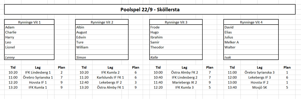 Hej! Det sista poolspelet för den här säsongen blir söndag 22/9 i Sköllersta (ca 30 min med bil från Örebro). Här kommer lagindelning och spelschema: Lagindelning enligt följande: Lag 1: Adam, Charlie, Harry, Leo & Lionel Matchtider; 10:20, 11:00, 12:20, 13:20 Lag 2: Albin, August, Edwin, Ture & William Matchtider; 10:20, 11:20, 12:40, 13:20 Lag 3: Frode, Hugo, Ibrahim, Samir & Theodor Matchtider; 10:00, 10:40, 11:40, 12:20 Lag 4: David, Elias, Julius, Melker A & Walter Matchtider; 11:00, 12:00, 13:00, 13:40 Vi vill att barnen är på plats senast 30 min innan första matchen börjar. Det innebär att vi träffas enligt följande: Lag 1: 9:50, Plan 2 Lag 2: 9:50, Plan 6 Lag 3: 9:30, Plan 7 Lag 4: 10:30, Plan 1 Adressen är: Idylliska Sköllervallen, 697 74 Sköllersta Om ni behöver skjuts till Sköllersta, kontakta någon av oss tränare så fösöker vi lösa det. Killarna får varsin matchtröja på plats. Vi vill att alla har med sig shorts, benskydd, fotbollsstrumpor, fotbollsskor och en vattenflaska. Tveka inte höra av er om ni har frågor. MVH Ledarna