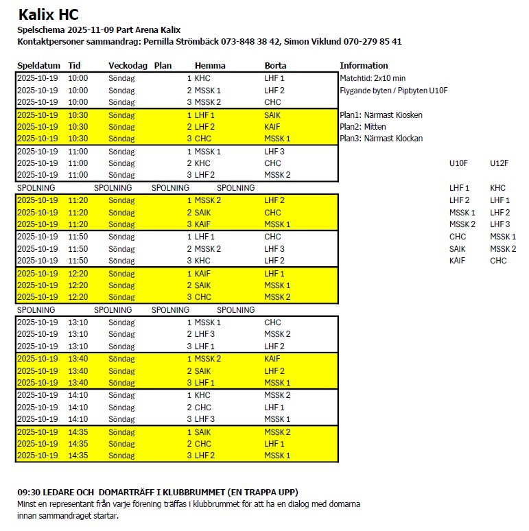 Bifogar schemat och infon för söndag. F10 matcherna är markerade i gult.