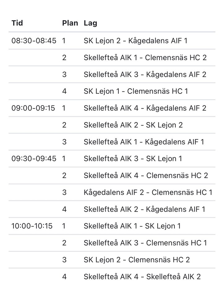 Samling kl. 08:00 i omklädningsrum 1. Spel 3 mot 3 med målvakter på fyra planer samtidigt i B-hallen.