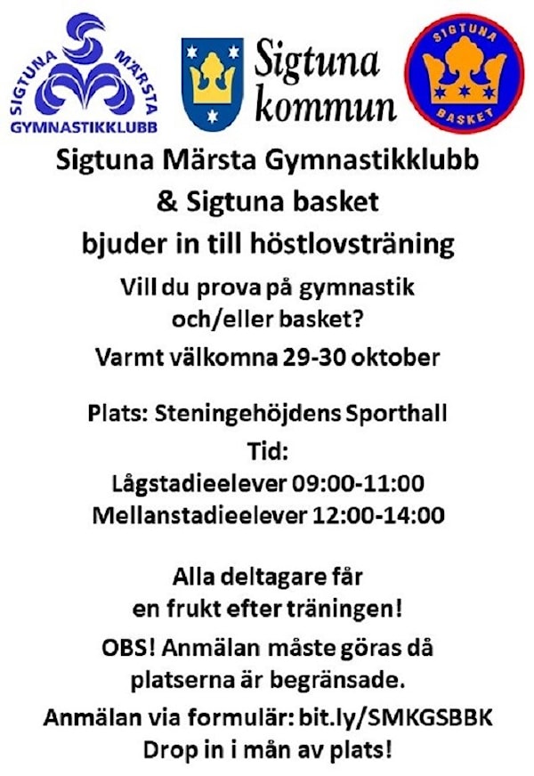 Välkomna till Höstlovsträning tisdag & onsdag i Steningehallen. Anmäl om ni kommer på www.bit.ly/smgksbbk