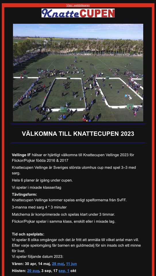 Hej. Nu har vi äntligen fått ihop en tränarstab av föräldrar så att vi kan se till att barnen får spela och träna så ofta det bara är möjligt. Vi kommer försöka gå diverse utbildningar som klubben förser oss med under året, så de tränas rätt och att barnen fortsatt är i trygga händer. Tanken är att vi i början av april ska påbörja utesäsongen beroende på gräsets hållfasthet och status, så vi inte förstör den. Vi äskade för två träningstider då flera av barnen vill spela och träna mer. Preliminärt har vi fått måndagar och onsdagar 17-18. (Måndagar på den bortre planen och onsdagar på den närmsta vid klubbhuset) Återkommer när det är fastställt. Vi jobbar på att anmäla laget till Knattecupen (se bild) och där kommer bli en lagfotografering (av proffs) den 13 maj i lilla gympasalen i Skegrie. Vi kommer därför behöva prova ut matchkläder i klubbhuset inom det snaraste. Så håll utkik efter mer info. Snart.