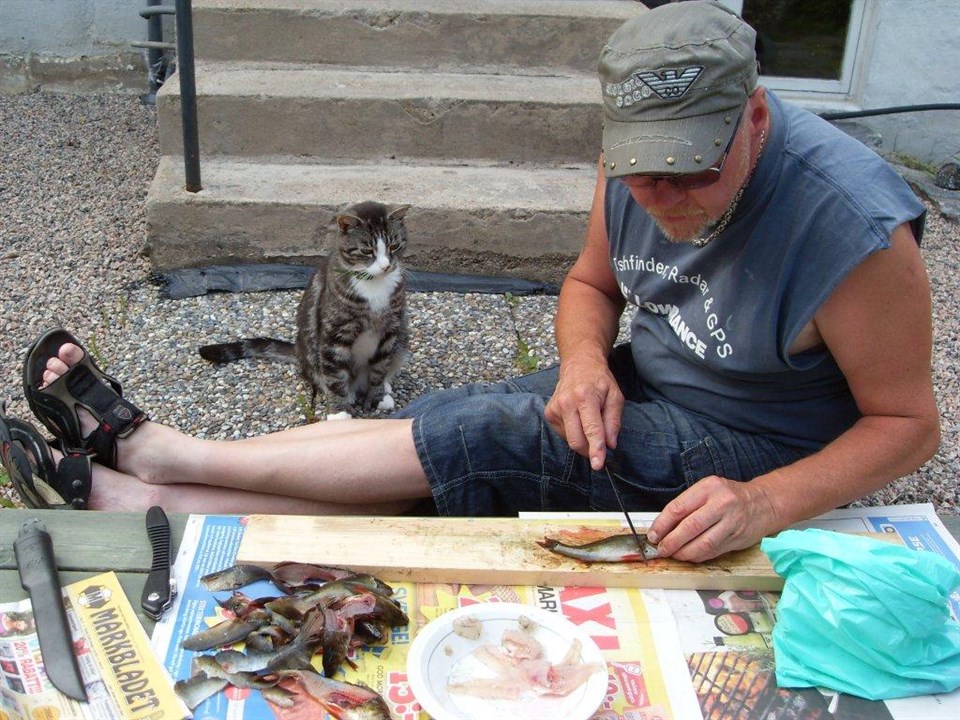 Du ville ha lite fiskerapport. Var i tolken i Torestorp o metade ...det blev några abborrar. Så nu sitter vi här jag & Knutte och rensar M.V.H Kaj o Knutte.