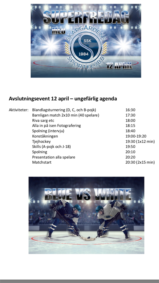 Hej Se nedan info om uppstartshelgen, schema ligger under dokument på laget.se. Samling 09:00 Fyskläder medtages Upplägg för helgen: Lördag: Som tidigare information så kommer vi under lördagen spela en blandlagsturnering med spelare från D-pojk upp till A-lag/Tjejlag. Turneringen startar klockan 10:00 och pågår till cirka 17:30. Matchena kommer spelas 1x15min med 1,5min byten (tuthockey) och vara på halvplan. Förhoppningen är att vi får ihop 10st lag, där lagen består av 1st målvakt och cirka 10st utespelare. Varje bokstavsgrupp (D, C, B, osv) har fått varsitt domarepass, cirka en timma per pass. Det innebär att den gruppen tillsättare domare en per spelplan, dvs två personer. Dessa grupper tar då också ansvar för att det finns någon vid klockanunder samma tidsperiod, denne personen skall också ha koll på slutresultaten i matcherna som förs upp på spelschemat. Viktigt att detta följs för att det skall fungera. Vi kommer inte köra med utvisningar utan om det mot förmodan skulle inträffa någon som gör något regelvidrigt så utdöms straff till det drabbade laget. Alla lagen är uppdelade i två grupper där alla möter alla i gruppen där efter avslutar vi med 5st finaler, E, D, C, B och A finaler, där resultaten i grupperna avgör vem som spelar vilken final. Under dagen kommer det serveras frukost, lunch och middag. Tider för detta står i bifogat. Tänk på att middagen inte är satt för lagen utan det beror på vilken final man spelar. Vi kommer även behöva hjälp från ledare som följer lagen så att det finns någon ledare med och ser till så gruppen fungerar. Jag kommer sätta en ansvarig grupp på respektive lag så vi har något att utgå ifrån, men där kan ni givetvis bytaom det passar, men tanken är att den gruppen då ser till så någon ledare finns med laget. Söndag: Under söndagen är det mer traditionellt, alla grupper har blivit tilldelade två ispass var, samt ett teoripass med värdegrund, värdegrunds passet håller två personer från klubben i. Det är dessa tider vi står med från klubbenssida vad gruppernaväljer att göra mellan dessa tider är upp till grupperna själva att planera, så som fys, teori, aktiviteter. Mat för dagen så serveras frukost, lunch och middag, tider för detta finns i bifogat. Allmänt: Gällande maten så kommer vi ha två tjejer som kommer rodda i disk mm. Men vi önskar och hoppas givetvis att det hjälps åt både från ledare och föräldrar så ta med er det och uppmana positivt till det så vi får så bra flyt som det går i matschemat.