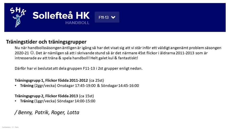 Nu när handbollssäsongen äntligen är igång så har det visat sig att vi står inför ett väldigt angenämt problem säsongen 2020-21 :-). Det är nämligen så att i skrivande stund så är det närmare 45st flickor i åldrarna 2011-2013 som är intresserade av att träna & spela handboll! Helt galet kul & fantastiskt! Därför har vi beslutat att dela gruppen F11-13 i 2st grupper enligt nedan. Träningsgrupp 1, Flickor födda 2011-2012 (ca 25st) - Träning (2ggr/vecka) Onsdagar 17:45-19:00 & Söndagar 14:45-16:00 Träningsgrupp 2, Flickor födda 2013 (ca 15st) - Träning (1ggr/vecka) Söndagar 14:00-15:00 / Benny, Patrik, Roger, Lotta
