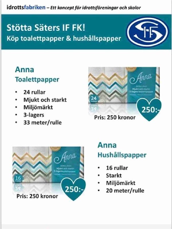 Nu är det dags för säsongens andra försäljning. Det är som tidigare år toalett och hushållspapper som ska säljas. Precis som tidigare år är det minst 5st balar per spelare/familj som skall säljas. Vill man får man självklart sälja fler. Det är Anna idrottspapper som gäller även iår.