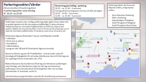 RapporteraDet kommer att finnas mer info när ni startar erat pass, men i stora drag går det ut på att finnas tillgänglig vid de huvudsakliga parkeringsområdena, indikera när det är fullt för att undvika att för många bilar fastnar inne på parkeringen, eventuellt ge förslag på andra områden där det finns parkering fast lite längre att gå (stora brännbo, stiftelsen, prästängarna etc). Vissa parkerar där det inte är tillåtet och frågar om det är ok, då måste vi säga att det är på eget ansvar, parkeringsreglerna ändras inte pga julmarknad (men vi är inte parkeringsvakter). Tipsa om hemsidan där parkeringar finns uppmärkta (vi brukar få en QR kod).