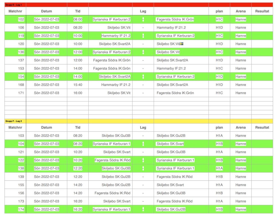Hej, Här kommer lite extra info inför Aroscupen på söndag. Alla i knattelaget är välkomna att hejja på sina lagspelare! Samling kl 07.30 på Hamre IP, Väderleksgatan 721 31 Västerås, barnen ska vara ombytta och klara. * Svarta Syrianska Match-tröja * Röda Syrianska Match-shorts * Benskydd, VIKTIGT! Barn får ej spela utan! * Röda fotbollsstrumpor * Fotbollsskor * Vattenflaska * Mellanmål, kioskförsäljning finns på plats med begränsat utbud Vi kommer samla in 50kr / spelare till Swish 0725453276. Första matchen spelas kl 08.00, se matchtider nedan. Spelschema kommer under morgondagen. Lag 2 Matchtider: Kl 08:00 - plan H1C Kl 10:00 - plan H1C Kl 12:00 - plan H1C Kl 14:00 - plan H1D Lag 1 Matchtider: Kl 08:20 - plan H1B Kl 10:20 - plan H1B Kl 12:20 - plan H1A Kl 16:20 - plan H1B