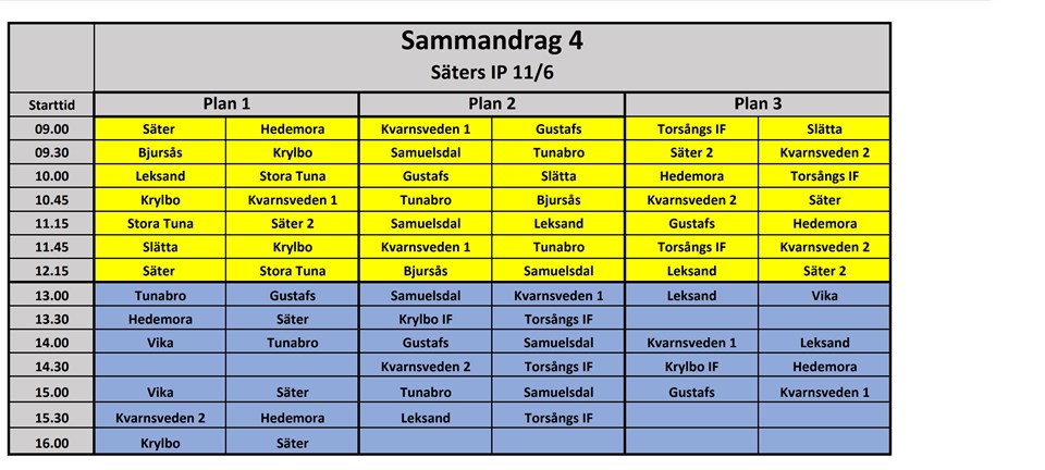 På söndag är det dags för matcher vid Säters idrottsplats. Se bild som vi fått från Säter angående parkering. Vi samlas 30 min före matcherna och alla spelar 2 matcher. Kom ihåg benskydd, svarta strumpor, svarta shorts, vattenflaska och att ta ut eller tejpa örhängen :-) Det kommer finnas möjlighet att köpa fika och hamburgare på plats. 09.30 Plan 2 mot Tunabro Maggie Greta Sara Myra Ida Maja Frida Sigrid Saga Lamija Idun 11.15 Plan 2 mot Leksand Ida Denise Meja Frida Sigrid Molly Saga Hilma Lamija Signe Idun Tuva 12.15 Plan 2 mot Bjursås Maggie Greta Sara Myra Maja Denise Meja Molly Hilma Signe Tuva F-14 Fotboll 9 jun 2023 2kommentarer
