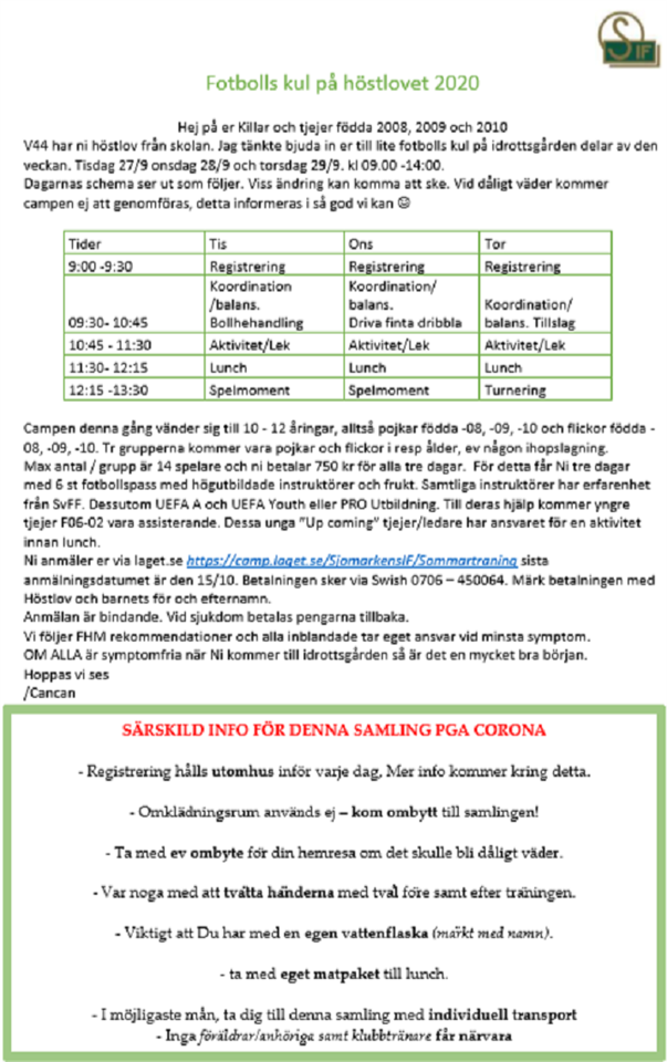 Hej! I och med kvällens träning är vi i P10 igång på riktigt med säsongen 2021. Därför vill vi tränare gå ut med några förhållningsregler som kommer gälla vid träningar och matcher. Meddela i god tid via sms om man inte kommer på träningar. Kom i tid till träningarna, och se till att ha ordentligt knutna skor. Alla som vill dricka vatten under träningar ska ha med sig en egen, fylld vattenflaska när träningen börjar. (Allt för mycket tid går åt till att gå och dricka vid utekranar el dyl.) Vid träningar och matcher är det fokus på fotboll som gäller. (Är man ofokuserad och flamsar så förstör man för de som kommer till träning/match för att spela fotboll. Vi tränare vet hur duktiga killarna är och hur bra de kan spela när de gör sitt bästa, och det är det vi vill försöka få in i träningarna och matcherna. På grund av restriktionerna och rekommendationerna kring covid-19 vet vi inte säkert när matcher kommer komma igång. (Första seriematchen var planerad till 9/5, men nu har alla seriematcher ställts in fram till den 18/5. Om vi får spela vår premiärmatch helgen den veckan återstår väl att se, och information om vad som gäller för träningsmatcher ska komma från föreningen inom kort.) I år har vi bara ett lag anmält till seriespel. Utifrån föreningens riktlinjer kommer vi ge killar som tränar regelbundet förtur framför killar som tränar sporadiskt till att spela matcher. För att få vara med och spela matcher krävs mer än 50% deltagande på träningar /Tränarna SIF/SIF P2010 26 apr 2021