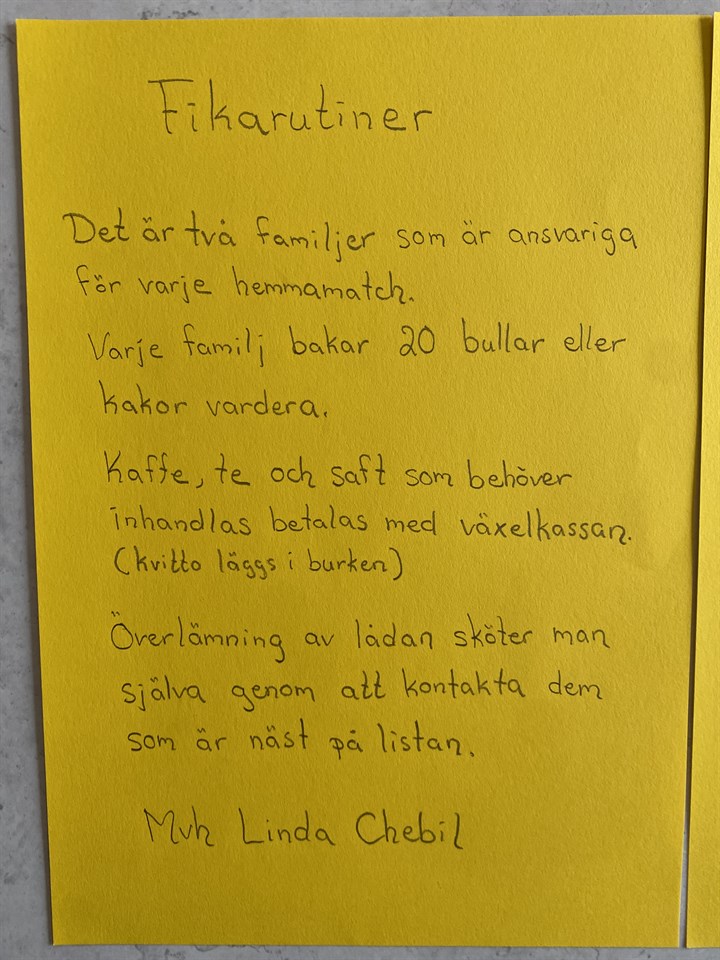 Hej, Fikaförsäljningen blev en liten miss när vi delade in för matcherna. Tar nya tag till 29/8 som är nästa hemmamatch, alla grejor finns hos mig. Kolla Linda Chebils inlägg om fikaförsäljningen och när ni har ansvaret, kan man inte lös det mellan varandra. Är inte många gånger som det gäller. Vi ska försöka skicka ut kallelserna till matcherna måndag/tisdag varje vecka, för att ni som föräldrar ska kunna planera - där är det lika viktigt för oss som tränare att ni svarar på dem inför match/träning så fort som möjligt. Fick även info att det måste finnas en matchvärd för alla hemmamatcher- föreningen fick tydligen en bot för att det missades.