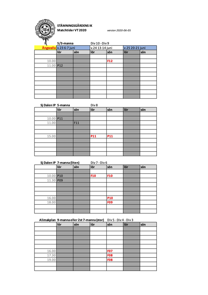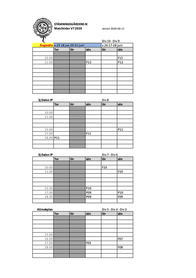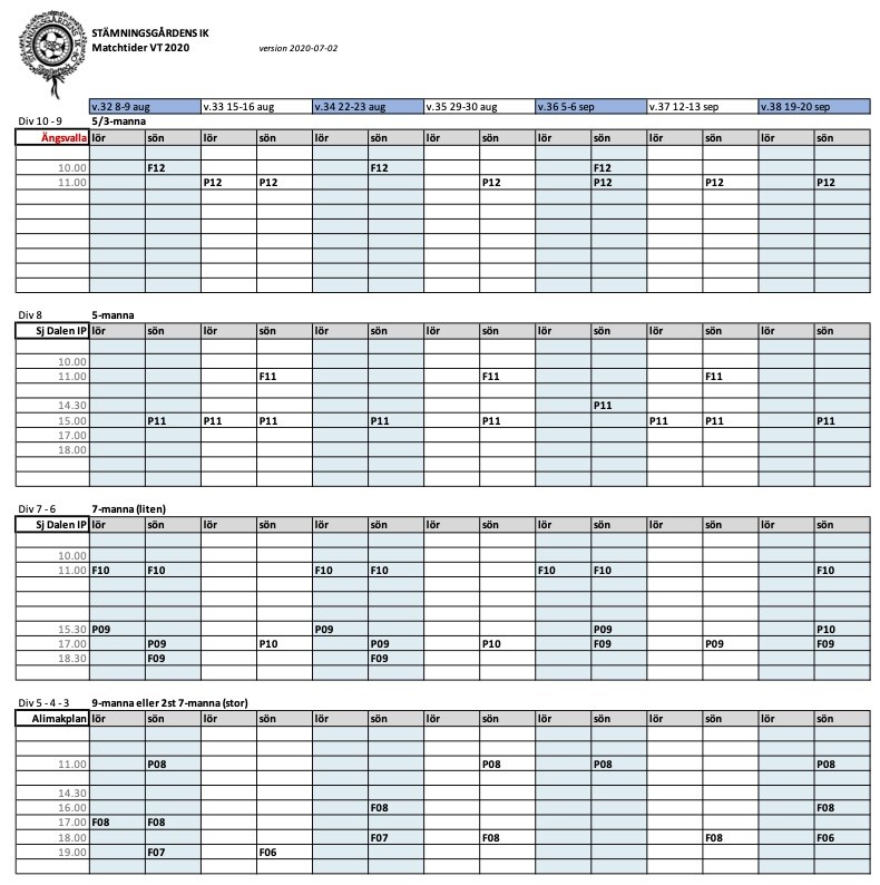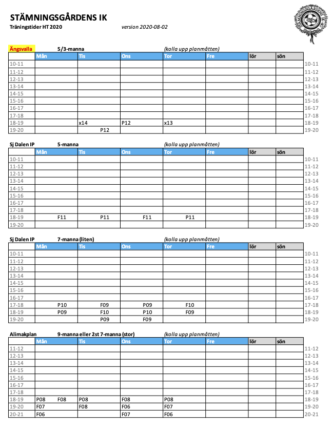 Hej Ledare! Nu finns schema för träningstiderna i höst, i stort sett samma tider som före sommaren, ändringar för P/F11. Ni hittar fördelningen av tider under //Dokument och mapp 2020 här på Ledarsidan Direktlänk till PDF här --> Träningstider gräset v32-36 Hypotesen är att från v.37 kan det behövas justera de sena tiderna för F06/F07 på Alimak, pga mörker. Samtliga tider på Alimak kommer troligen att tidigareläggas 1tim fr v.37 Behöver ni hitta ett bättre schema så gör först och främst ett försök att byta sinsemellan inom er division, dvs tex P10 pratar med F10 om ni kan byta tider. Som ni säkert förstår är det helt omöjligt att alla lag tränar kl 18.00 varje gång. Jag lämnar nu tillbaka uppgiften med plantider till ordinarie Monika Windling, hon nås på samma mail enl nedan. Tackar för mig och önskar er lycka till med höstens träningar och matcher i denna grymma förening. En fd Stämningsgårdens IK's spelare på landslagsnivå är Alice Lindgren, f.2003, en grym spelare som fick sin tidiga skolning i våra färger, jag är övertygad att det kommer fler.. Hoppas att det nu blev rätt med tidern och att jag inte gjort något generalfel. Återkoppla på bokning.sik80@gmail.com mvh Olof