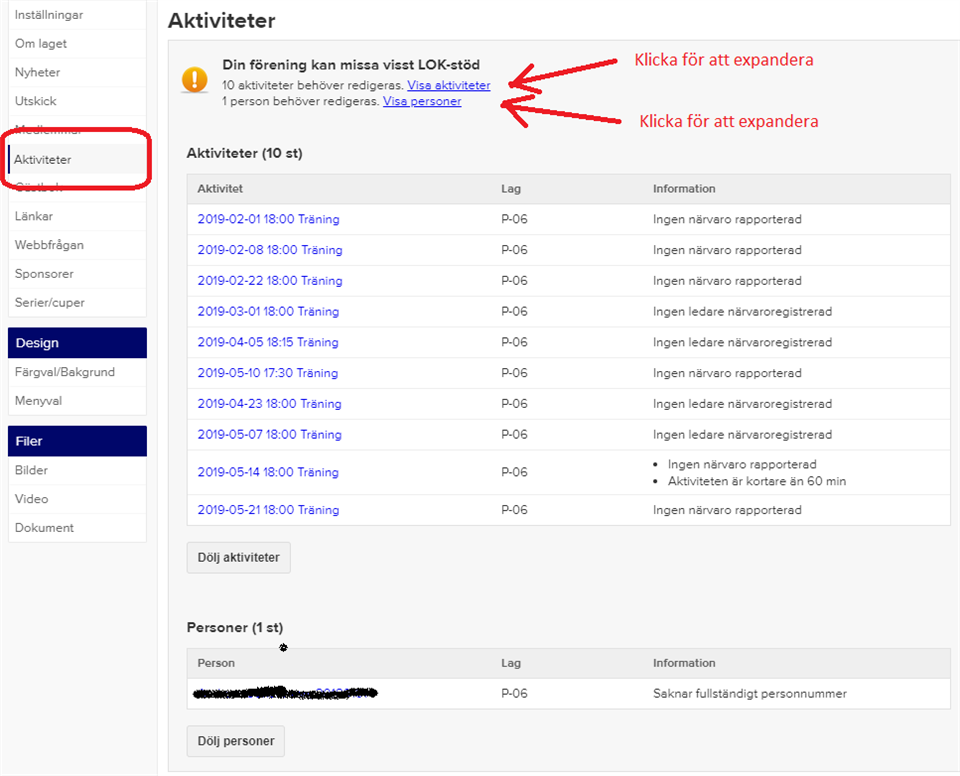 Nu är det snart dags för föreningen att skicka in LOK-stödsansökan, vilken är en viktig del av föreningens finansiering. Hur mycket pengar vi får beror på er närvarorapportering, så därför är det nu dags att se över rapporteringen för vårens aktiviteter. Jag har kollat igenom de olika lagens rapporteringsstatus och glädjande nog verkar många av lagen sköta detta löpande på ett bra sätt. Det finns dock vissa lag som har litet arbete att göra. På er laget-sida, inloggad som administratör, gå till menyvalet Aktiviteter så visas läget för ert lag. Om något fattas så visas en orange ikon och en lista över de olika problem som identifierats (se bilden). Att tänka på: -spelare och ledare behöver ha fullständinga personnummer registrerade för att vi ska få pengar för deras deltagande i aktiviteter. -kom ihåg att närvarorapportera matcher, vi får pengar även för dessa. -om någon aktivitet av någon anledning inte genomförts så är det bättre att ta bort den än att låta den finnas kvar utan närvarorapportering -kortare specialaktiviteter som inte ska närvarorapporteras, typ föräldramöten, kan man få bort ur listan över fel genom att redigera aktivitetsinformationen och bocka ur lok-aktivitetsrutan. Deadline för komplettering av närvarorapportering är 2019-08-15!