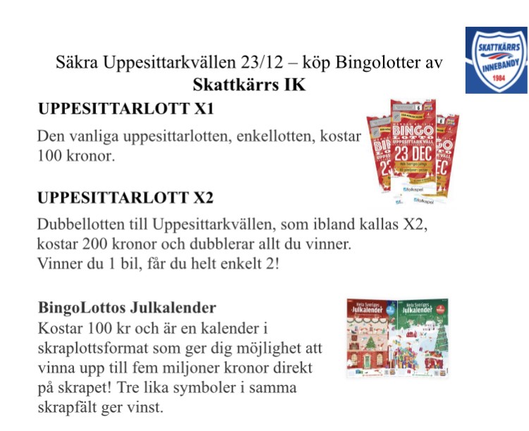 Vi närmar oss jul & det är dags att sälja bingolotter till uppesittarkvällen och kalender. Enkellott - 100kr Dubbellott - 200kr Julkalender - 100kr Maila (lina_noleryd@hotmail.com) eller sms (073-677 37 91) mig för beställning så leverar jag dem till er på en träning innan 1/12. Kolla av med era nära & kära, grannar & kollegor och köp gärna era lotter via Skattkärrs IK för att sponsra klubben. / Lina (Gabriels mamma)