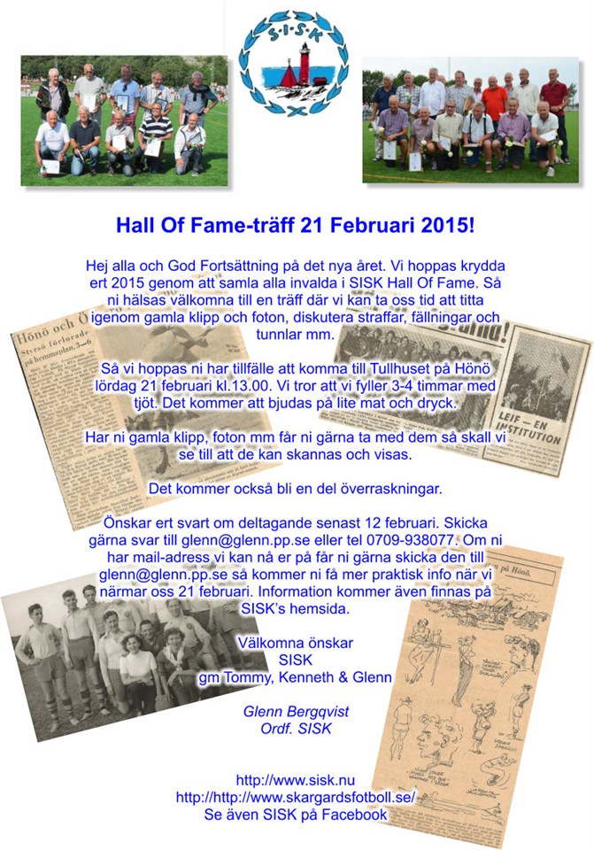 Hej alla och God Fortsättning på det nya året. Vi hoppas krydda 2015 genom att samla alla invalda i SISK Hall Of Fame. Så ni hälsas välkomna till en träff där vi kan ta oss tid att titta igenom gamla klipp och foton, diskutera straffar, fällningar och tunnlar mm. Personlig inbjudan är skickad till alla invalda. Välkomna! SISK