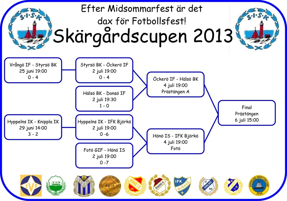 Söndag 30 juni kl 15:00 spelades SISK-cupens final mellan Björkö B och Öckerö B. Matchen speladess på Björkö eftersom de hade borta plan i förra omgången då Öckerö hade hemmaplan. Öckerö B vann med 4-3 (2-1) efter en ganska jämn matche där Öckerö hade första halvlek och genom Mattias Sennerstan satte 1-0 samt genom Murr/Pontus/Filip (flera olika besked) även gjorde 2-0 innan Linus Granstav reducerade till 1-2, vilket blev halvtidsresultat! I andra halvlek var det Björkö som spelade upp sig och tog delvis över. Men Öckerö gjorde 3-1 genom Markus Olsson innan Björkö reducerade till 2-3 genom ??? och även kvitterade till 3-3 på straff genom Linus Granstav. Men i slutet av matchen kom Öckerö igen något och kunde genom William Larsson avgöra och vinna med 4-3! SISK säger ett STORT GRATTIS till Öckerö B som återigen vann SISK-cupen! SISK vill också säga ett speciellt tack till domaren Joalim Siljat som pga ett missförstånd av bokad domare fick dra på sig domartröjan. Båda lagen har idel beröm till Joakim och kanske har vi där en blivande domare? Tack också till Ulf och Pax som agerade linjedomare. Vi hoppas få in foto samt korrekta målskyttar inom kort. ................................................................................................ Tidigare omgångar i SISK-cupen med målskyttar och lite referat kommer här: .................................................................................................................... Fredag: Semifinal i SISK-cupen mellan Skärgården och Björkö B kl 18:30. Det var en match där Björkö hade ett mycket bra lag och den utomordentligt trevlige Ulf Andreasson njöt vid sidan. Skärgården försökte men Björkö var bara för starka. Slutresultatet blev hela 7-1 och betyder att Björkö möter Öckerö B hemma på söndag kl 15:00. Se glädjen hos killarna - foto (tack Andreas) ................................................................................................................... Torsdag: Semifinal i SISK-cupen mellan Öckerö B och Hälsö B kl 19:30. En fantastiskt fin kväll då Sara öppnat kiosken och publiken strömmade till ordentligt. Första halvlek var ganska jämn men utan mål. I andra var det Hälsö som satte första målet genom manne som sprang som hand aldrig gjort tidigare (sa Erik och Manke på kanten) - Manuel! Han drog på mål från högerkanten istället för att spela snett bak eller dra en höjdare (vi har ju ingen Ragnvald Konkell längre sa Erik). Och Hälsö spelade optimistiskt men lite dog matchen när Öckerö genom Alexander Simonsson och Jonathan Alexandersson under relativt kort tid först utjämnade till 1-1 och sedan satte 2-1. Och sedan missade man två (!) straffar...(jag har aldrig missat en straff sa Erik och Manke nickade). Hälsö stack visserligen upp i några chanser men sedan kom Krille in de sista fem och gjorde direkt 3-1, vilket blev slutresultat och Öckerö vann rättvist, sa Tord Johansson. Och övriga gubbar på kanten gav faktiskt högt betyg till domaren (stråt vassare än Jompa, sa Erik). ................... Kvalomgång 1. Skärgården FC - SH/84, 23 juni kl 16:00 Prästängen A (Domare: Kaj Wendel) - Ändrat från 18 juni pga B-plan är avstängd. Resultat: 5 - 1 målskyttar: William Wallich, Henrik Gustafsson, Jesper Hidetun, Jan Samuelsson och Jonathan Börjesson (straff). SH; ? 2. Öckerö jun - Hönö C, 16 juni kl 16 på Långesand (Domare: Ulf Liljekrans) Under lördag em meddelades WO då Hönö C inte fick ihop lag. Åke J informerar domare / Resultat blir alltså 3 - 0 / TW 3. Nordö - Björkö B, 23 juni kl 14 på Knippla (Domare:..........) Resultat: 0 - 1, Målskytt: Joakim Siljat .................. Kvartsfinaler 1. Skärgården FC - Donsö B, 24 juni kl 19 på Prästängen B (Martin Gustafsson) Resultat: 3 - 1 (1-1): Målskytt Donsö: självmål. Målskytt Skärgården: Henrik Gustavsson, Jesper Hidetun 2 2. IFK Björkö B - Öckerö juniorlag, 25 juni kl 19, på Björkö (Kaj Wendel) Resultat: 2-1 (1-1) Målskyttar Björkö: Linus Granstav, Christoffer Pettersson Målskyttar: Öckerö: Rasmus Sundqvist (straff) På Björkö gjorde Öckerös juniorer en riktigt bra match och var så nära att besegra Björkö B, men ödet var inte riktigt med när Björkö i slutet gör 2-1 och vinner... 3. Öckerö C - Öckerö B, 24 juni kl 19 på Långesand (Domare: Ulf Lundin) Resultat: 0-2 Mål: Alexander Ivarsson samt självmål. /Enl Glenn en relativt jämn match där C-laget stod upp bra/ 4. Hönö B - Hälsö B, 25 juni kl 19 på Prästängen A (Domare tillsätts av Hönö enl samtal Glenn) Resultat 4-4 (1-4) efter full tid och 4-5 efter förlängning. Utvisning: Jesper Olofsson, Hälsö Målskyttar Hönö: Emil Tobiasson Harris (straff), Sebastian Bäregård, Jonathan Jansson, Henrik Sörensson. Målskyttar Hälsö: Jesper Olofsson (straff), Joakim Rydell, Joakim Rydell, Frans Dino och Johannes Ludvigsson Litet referat: På Prästängen spelade Hönö B mot Hälsö B och förhandssnacket bland många var att Hönö vinner relativt lätt, men det blev faktiskt en för svår nöt att knäcka. Hälsö ledde med hela 4-1 i halvtid, men efter bla en utvisning på Jesper i Hälsö, kom Hönö i kapp och det stod 4-4 efter full tid. Domaren Ulf Lundin blåste di i pipan för förlängning 2 x 10 min och det var mest Hönö hela förlängningen. Men när det återstod ca 20 sek tar Manuel bollen på högerkanten och slår ett inlägg som efter lite palaver dras in av Johannes Ludvigsson och Hälsö vinner alltså med 5-4! Semifinaler spelas senast 28 juni 1. Skärgården FC - Björkö B, på Prästängen B 28 juni kl 18:30. (Domare: Ulf Lundin) Resultat 1 - 7. Målskyttar Skärgården: Jesper Hidetun. Målskyttar Björkö: Anders Fransson 2, Johan Magnusson-Otter 2, Marcus Wiseman, Gustav Engström, Christopher Pettersson 2. Öckerö B - Hälsö B 27 juni kl 19:30 Prästängen A (Domare: Ulf Lundin) Resultat: 3 - 1 (0-0) M
